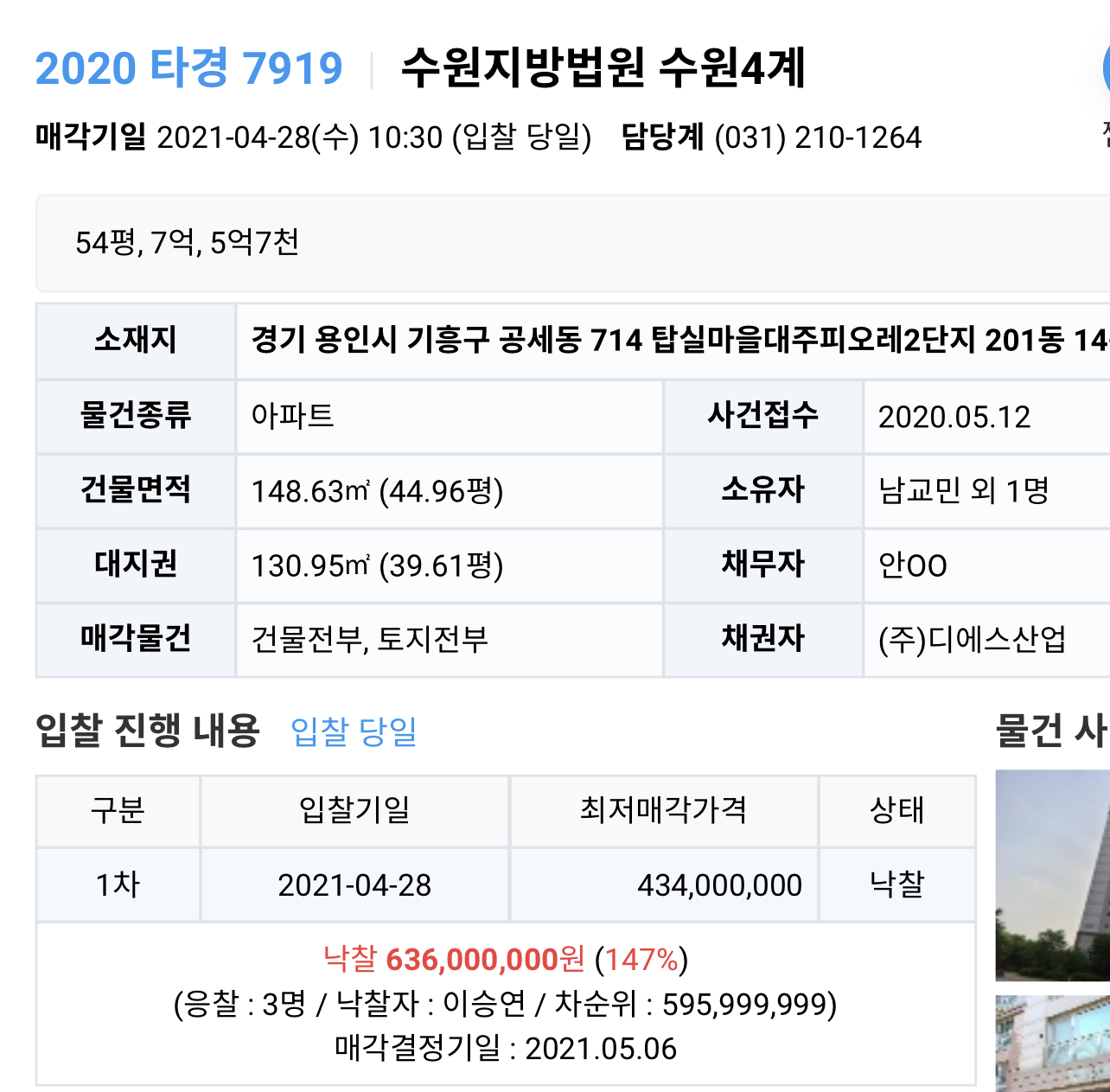 결과는 낙찰가 6억3천6백수준으로 모의입찰가대비 6천만원차이났으며 낙찰자는 시세대비 차익 6천만원 수준으로 낙찰 받았습니다.