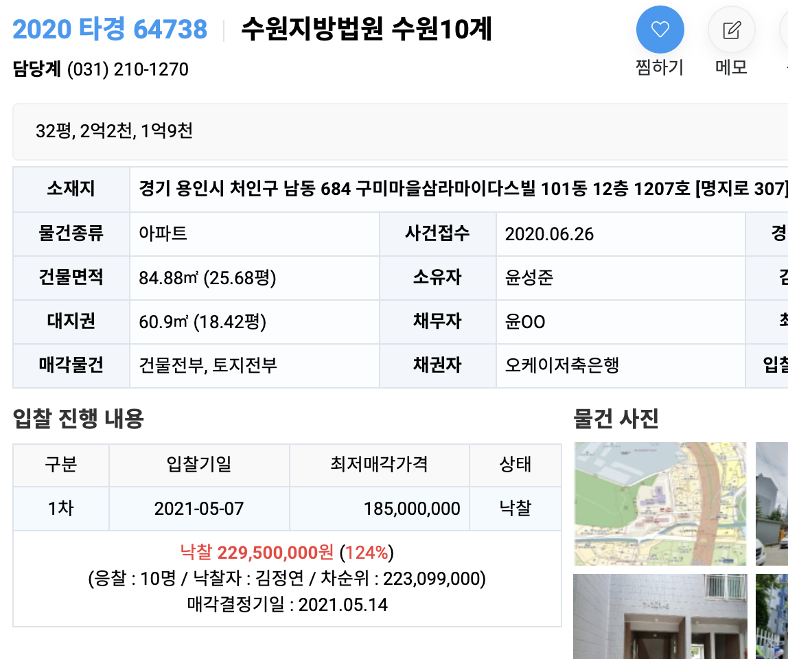 10명 응찰에 낙찰금액 2억2천9백으로 실거래가에 가까웠습니다.