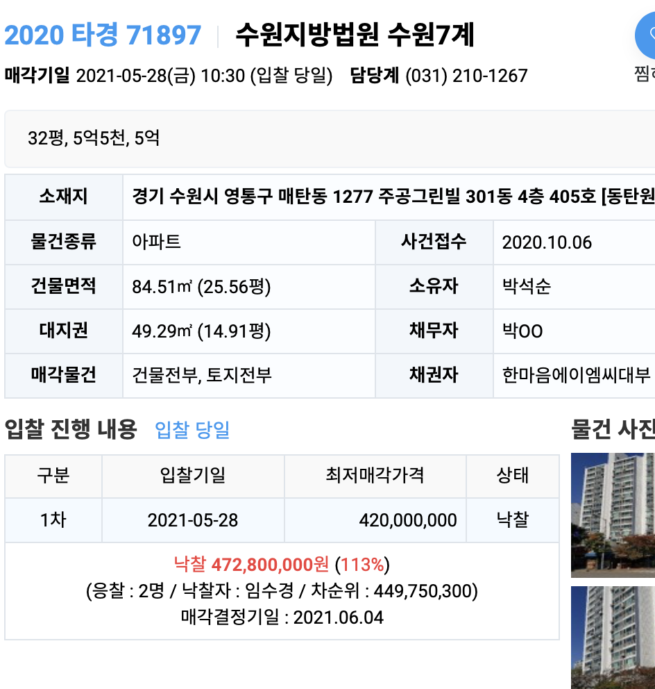응찰은 2명이었으며 낙찰가는 4억7천입니다.