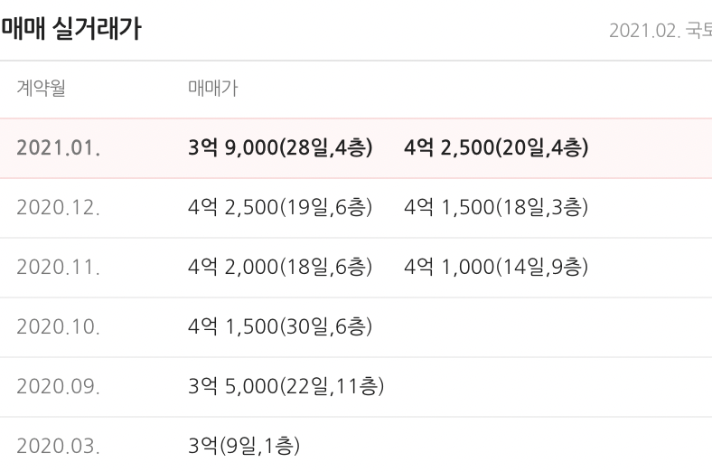실거래가는 21년 1월 4억2500만원이 최고가이이며 4층입니다.